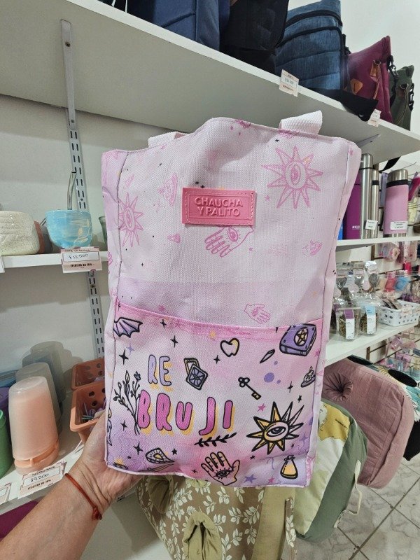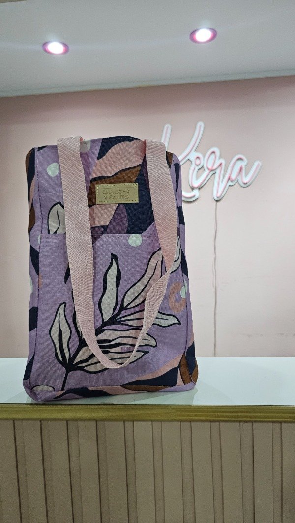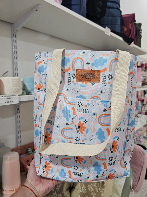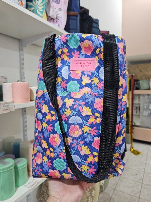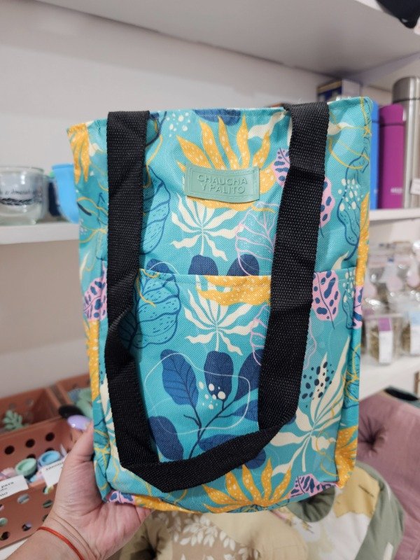BOLSO MATERO ESTAMPADO, FORRADO CON MATERIAL IMPERABLE, TIENE FAJA PORTA TERMO Y BOLSILLO EXTERIOR.